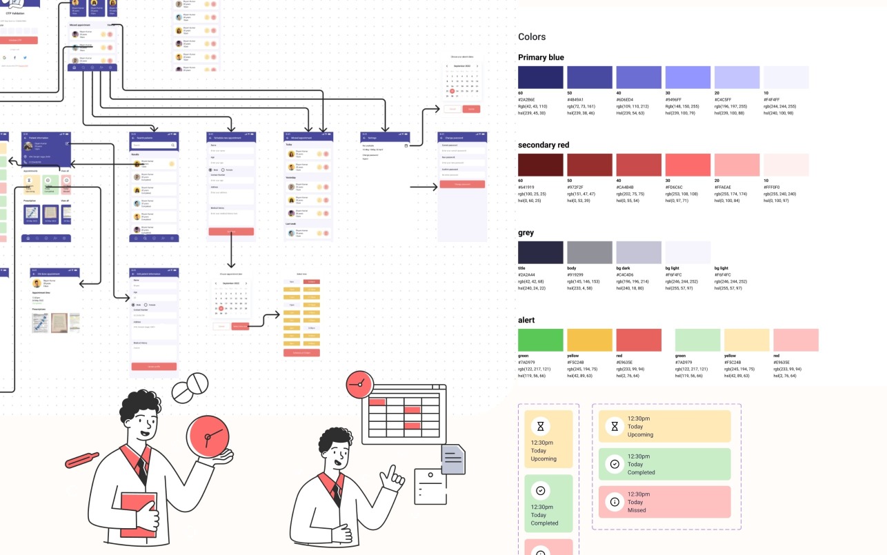 10. An App project in Figma. User flow diagram, low mid and hi-fi wireframes